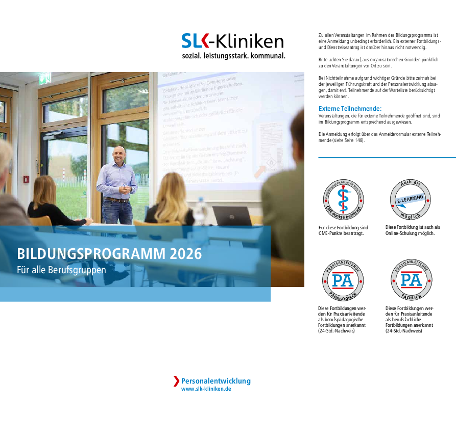Wir unterstützen Sie bei der beruflichen und persönlichen Weiterentwicklung. Im Rahmen des internen Bildungsprogramms wird ein breites Spektrum an unterstützenden Maßnahmen, Fort- und Weiterbildungen für jede Berufsgruppe angeboten. Diese reichen von Pflichtfortbildungen über fachliche Themen bis hin zur Stärkung der Persönlichkeits- und Sozialkompetenz. Darüber hinaus unterstützen wir den Besuch von externen Fort- und Weiterbildungen.