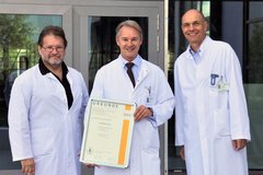 Für Patienten mit Gefäßerkrankungen ist das Gefäßzentrum im Klinikum am Plattenwald die erste Adresse in der Region. Dies hat nun die Zertifizierung durch die Deutsche Gesellschaft für Gefäßchirurgie und Gefäßmedizin (DGG) bestätigt. Jetzt konnten Dr. Thomas Karl, Direktor der Klinik für Gefäß- und Endovascularchirurgie, Professor Thomas Dengler, Direktor der Klinik für Innere Medizin I, und Professor Reinhard Tomczak, Leiter der Klinik für diagnostische und interventionelle Radiologie, die Urkunde entgegen nehmen. Das Gefäßzentrum bietet modernste, schonende Untersuchungs- und Behandlungsverfahren, die in vielen Fällen eine Operation überflüssig machen können.